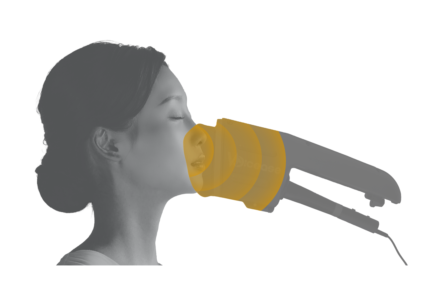Voiceaseは約‐20㏈の遮音効果があります。呼吸は通すが音は通さない「消音機」が内蔵されており、鼻まで覆って確実に収音、遮音をしながらも呼吸が自然にできる形を実現しました。また、様々なお顔の形状にフィットするマスクと内部の吸音材が遮音効果をさらに確実なものとしています。